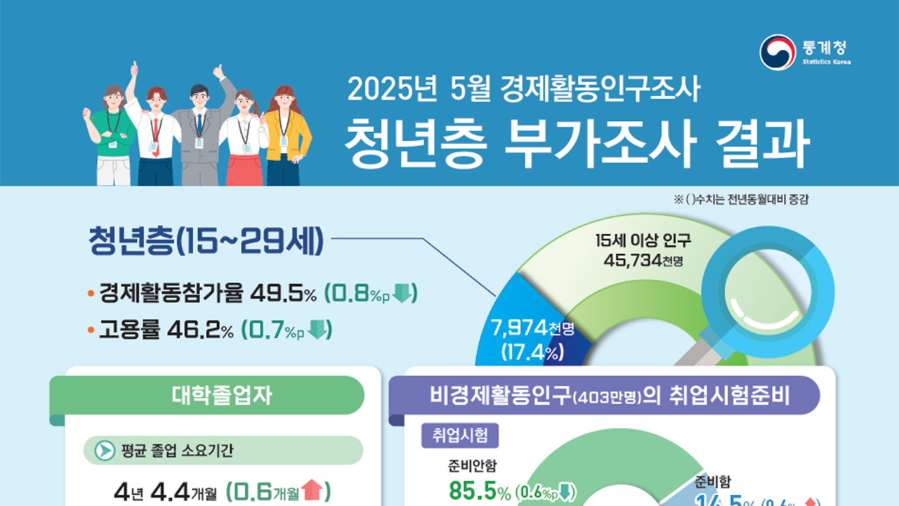 사진 제공 통계청청년 미취업자 절반가량이 최종 학교 졸업 후 1년 이상 일자리를 구하지 못한 것으로 나타났습니다.통계청이 발표한 '2025년 5월 경제활동인구 조사 청년층 부가 조사 결과'를 보면 최종 학교 졸업자 중 미취업 기간이 1년 이상인 경우는 46.6%로 전년 동월 대비 1.0% 포인트 상승했습니다. 1년 미만(6개월...
