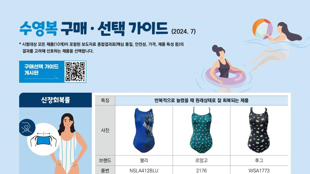 사진 제공 한국소비자원시중에 판매되는 여성용 수영복의 내구성과 기능성이 제품별로 차이가 있는 것으로 나타났습니다. 한국소비자원은 소비자 선호도가 높은 브랜드의 여성용 수영복 10개 제품(폴리에스터·폴리우레탄 소재 7개, 폴리에스터 소재 3개)의 기능성, 내구성 등 품질 및 안전성 시험 결과를 발표했습니다. 수...