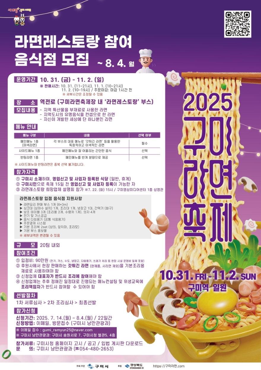 경북 구미시가 세상에서 가장 긴 라면 레스토랑의 세프를 찾습니다. 구미시는 10월 31일부터 11월 2일까지 열릴 '2025 구미 라면 축제'의 특별 식음 존인 '세상에서 가장 긴 라면 레스토랑'에 함께 할 세프와 지역 음식점을 모집합니다. 라면 레스토랑은 구미역 앞 도로 475m 구간에 만들 예정인데, 참여자들은 자신만의 독...