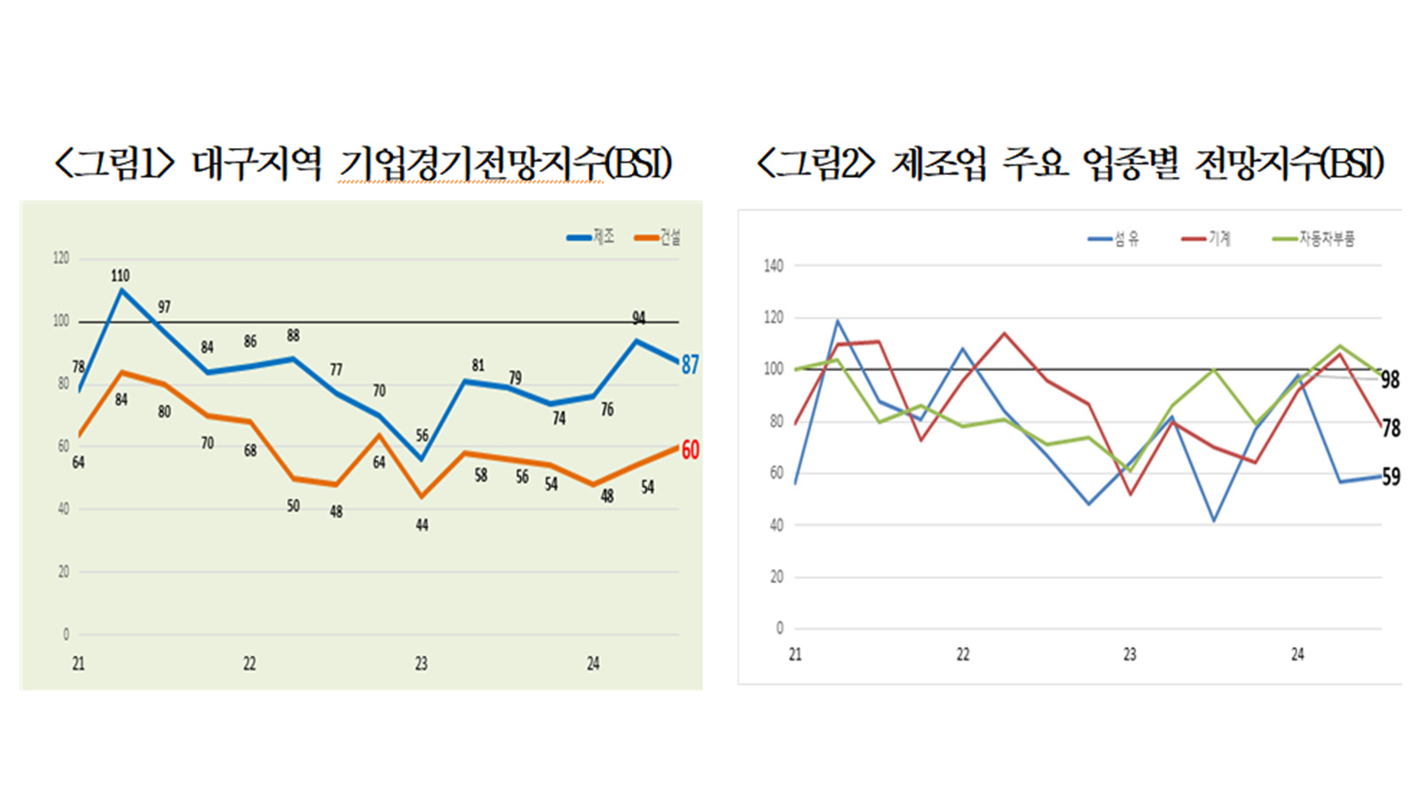 대구의 제조업 경기 전망이 3분기 만에 하락세로 돌아섰습니다. 대구상공회의소가 지역기업 210개 사(제조업 160개, 건설업 50개)를 대상으로 기업경기전망지수(BSI: Business Survey Index)를 조사한 결과 3분기 제조업 종합경기 전망 BSI가 87로 지난 2분기(94)보다 7포인트 하락했습니다. 제조업 전망 BSI는 1분기 76, 2...