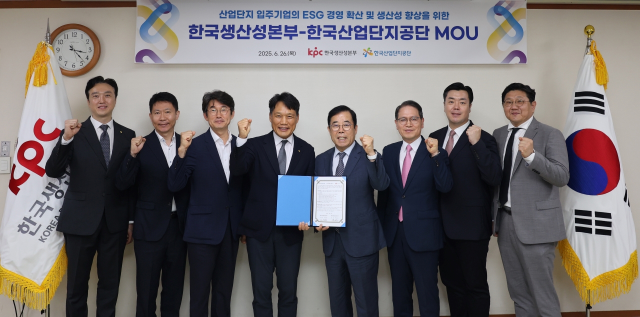 한국산업단지공단과 한국생산성본부는 6월 26일 산업단지 입주기업의 ESG 경영 확산과 생산성 향상을 위한 업무협약을 체결했습니다.이상훈 한국산업단지공단 이사장, 박성중 한국생산성본부 회장 등 기관 관계자 10여 명이 참석한 협약식에서 두 기관은 항구적인 협력 파트너십을 구축하고 산업단지 입주기업이 ESG 경영과...