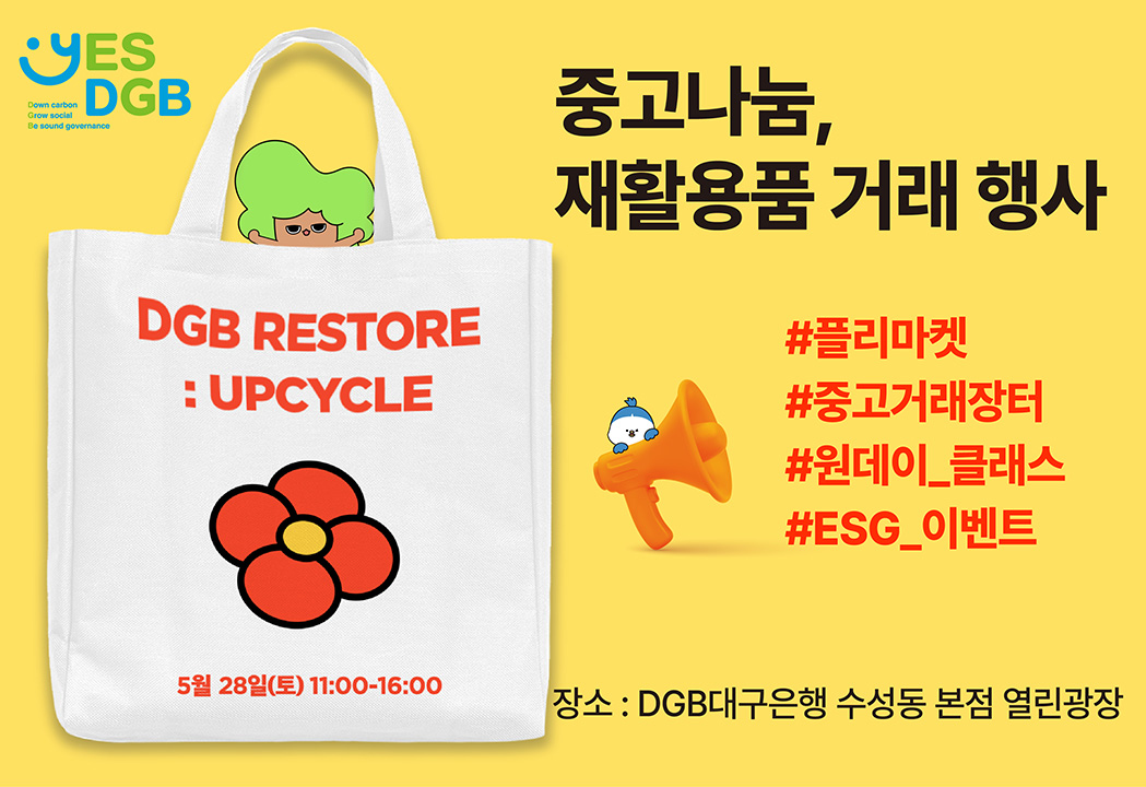 DGB대구은행은 5월 28일 도시철도 2호선 대구은행역 2번 출구 앞 본점 열린 광장에서 시민이 참여하는 중고 물품 나눔 행사를 비롯해 재활용품 활용 체험 부스, 친환경 제품 플리마켓을 엽니다.창립 55주년을 맞아 열리는 이날 행사는 시민 누구나 '아나바다' 행사에 참여할 수 있는 중고 거래 '리스토어' 코너부터 재활용...