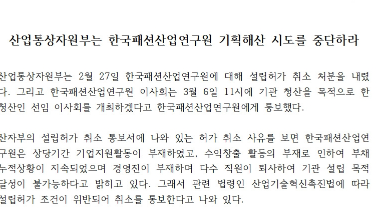 산업통상자원부가 한국패션산업연구원 설립 허가 취소 처분을 내린 데 대해 공공연구노조가 성명을 내고 해산 근거에 오류가 있다며 중단하라고 요구했습니다. 공공연구노조는 산자부가 허가 취소 사유로 제시한 기업 지원활동 부재 등 업무가 중단된 가장 큰 이유는 산자부 국장 등이 포함된 이사회가 본연의 임무를 수행...