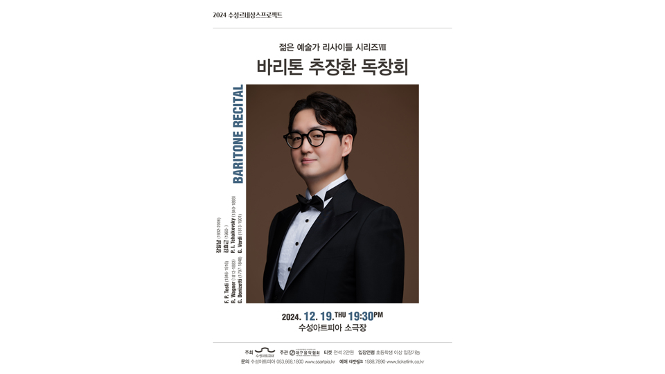 대구 수성아트피아가 주최하는 바리톤 추장환 독창회'가 12월 19일 저녁 7시 30분 수성아트피아 소극장에서 열립니다. 2024 수성르네상스프로젝트 '젊은 예술가 리사이틀 시리즈'의 마지막 공연입니다. 추장환은 한국과 이탈리아에서 공부한 성악가로, 토스티의 연가곡 '마린코니아'를 부릅니다. 이어 바그너의 '오 사랑스...