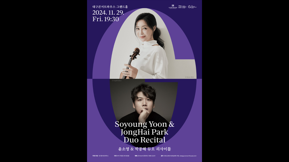 바이올리니스트 윤소영과 피아니스트 박종해가 11월 29일 저녁 7시 30분 대구콘서트하우스 그랜드홀에서 함께 공연합니다. 이들은 드뷔시의 '바이올린과 피아노를 위한 소나타 g단조', 노르웨이 민속 춤곡의 영향을 받은 그리그의 '바이올린과 피아노를 위한 소나타 c단조', 마지막으로 베토벤의 '바이올린과 피아노를 위한...