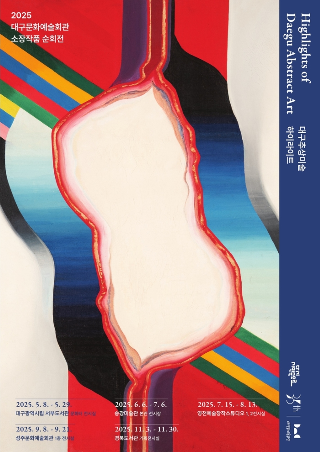 소장전대구문화예술회관은 11월 30일까지 대구·경북 5개 문화예술 기관에서 소장 작품 순회전 '대구추상미술 하이라이트'전을 차례로 엽니다. 대구문화예술회관의 소장 작품 1,200여 점 중 박광호, 유병수, 이향미, 정점식 등 대구에서 활동한 작가들의 추상회화 작품 35점을 순회전을 통해 소개합니다. 대구 미술에서 '추...