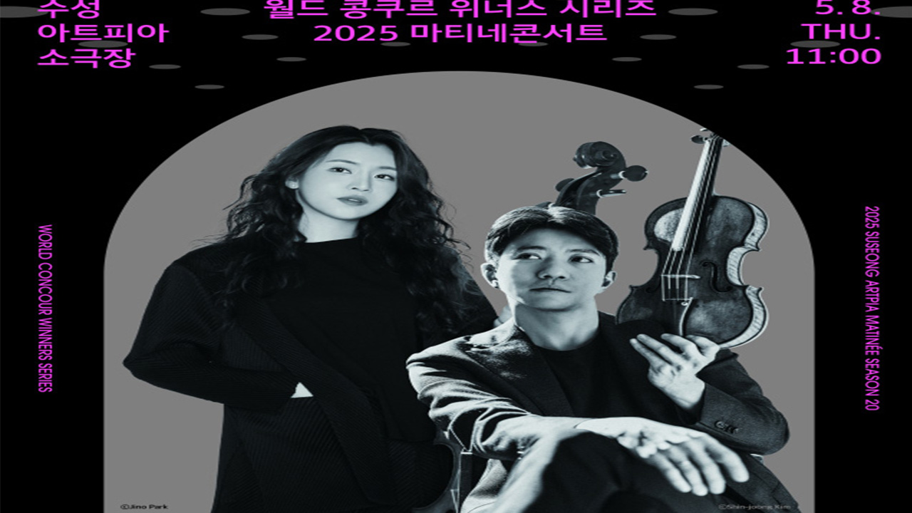 수성아트피아는 5월 8일 오전 11시 소극장에서 마티네 콘서트 '월드 콩쿠르 위너스 시리즈'의 두 번째 공연으로 바이올리니스트 김영욱과 첼리스트 박유신의 합동 콘서트를 엽니다.이번 무대는 베오그라드 쥬네스 국제 콩쿠르와 드레스덴 국립음대 실내악 콩쿠르에서 각각 우승한 바이올리니스트 김영욱과 첼리스트 박유신...