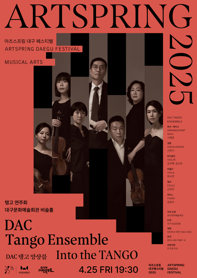 사진 제공 대구문화예술회관대구문화예술회관이 탱고를 전문으로 하는 연주단체 '탱고 앙상블'을 결성하고 4월 25일 오후 7시 30분 대구문화예술회관 비슬홀에서 첫 공연을 합니다. ‘탱고 앙상블’은 대구 국제현대음악제 예술감독인 서영완 감독이 콘트라베이스를 맡고, 편곡 박지영, 바이올리니스트 김지혜, 김소정, 비올...