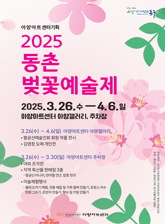 대구 동구문화재단 아양아트센터는 3월 26일부터 4월 6일까지 '2025 동촌 벚꽃예술제'를 엽니다.2025년으로 다섯 번째인 '동촌 벚꽃예술제'는 동촌유원지에 핀 벚꽃을 구경하는 시민에게 미술 작품 감상과 체험 행사 기회를 주고 특산품 홍보관을 운영해 봄나들이의 즐거움을 줍니다. 같은 기간 아양갤러리에서는 '팔공산예...