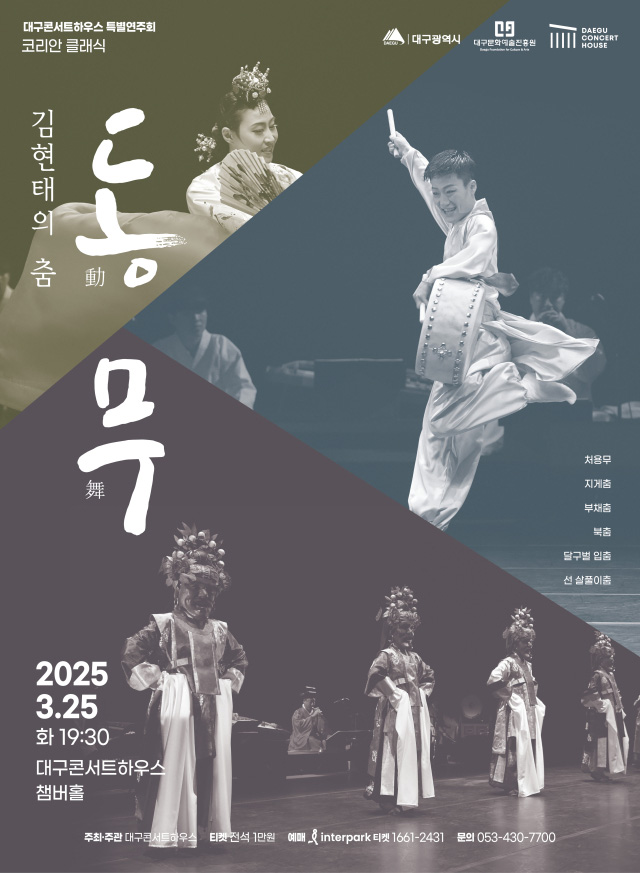 대구콘서트하우스는 지역 무용가와 함께 한국 전통 춤을 선보이는 무대를 3월 25일 저녁 7시 30분 챔버홀에 올립니다.이번 공연의 부제는 '동무'로 지역 무용가 김현태와 경북예고 무용과 21~56회 졸업생 19명이 처용무, 지게춤, 부채춤 등의 여러 소재를 활용한 춤을 선보입니다. 가장 오래된 궁중무용 '처용무'로 시작해 ...