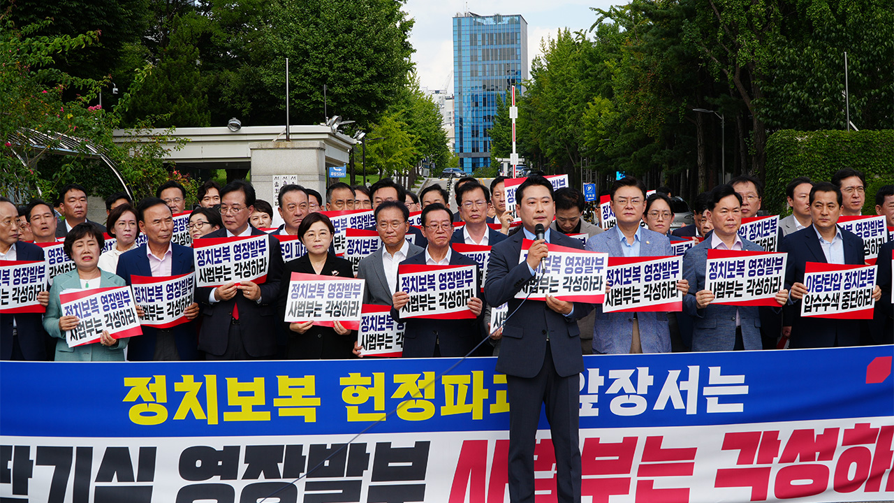 국민의힘은 김건희 씨 의혹을 수사하는 민중기 특별검사팀 사무실 앞에서 의원총회를 열고, 특검의 압수수색을 중단하라고 요구했습니다.송언석 비상대책위원장 겸 원내대표는 8월 18일 서울 종로구 KT광화문빌딩 앞에서 열린 긴급 의원총회에서 "이재명 정권의 행동대장 민중기 특검에 경고한다. 지금 특검은 위헌적 위법...