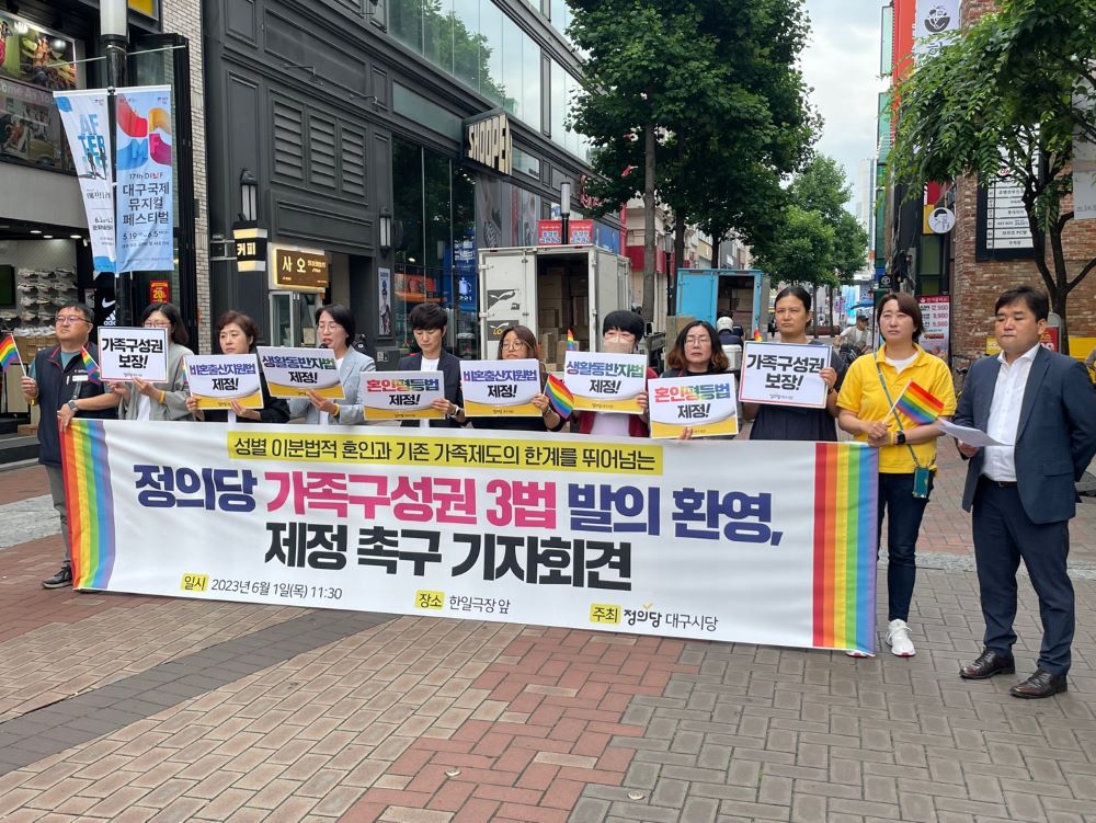 정의당 대구시당은 5월 31일 정의당 장혜영 국회의원이 대표 발의한 '가족 구성권 3법'을 환영하며, 국회에 제정을 촉구하는 기자회견을 열었습니다."현재 다양한 형태의 가족이 함께 살고 있지만 혼인, 혈연을 넘어선 가족 구성원은 사회 안전망에서 배제돼 불안정하게 살고 있다"며 "정의당이 발의한 법은 소외된 사람의 ...