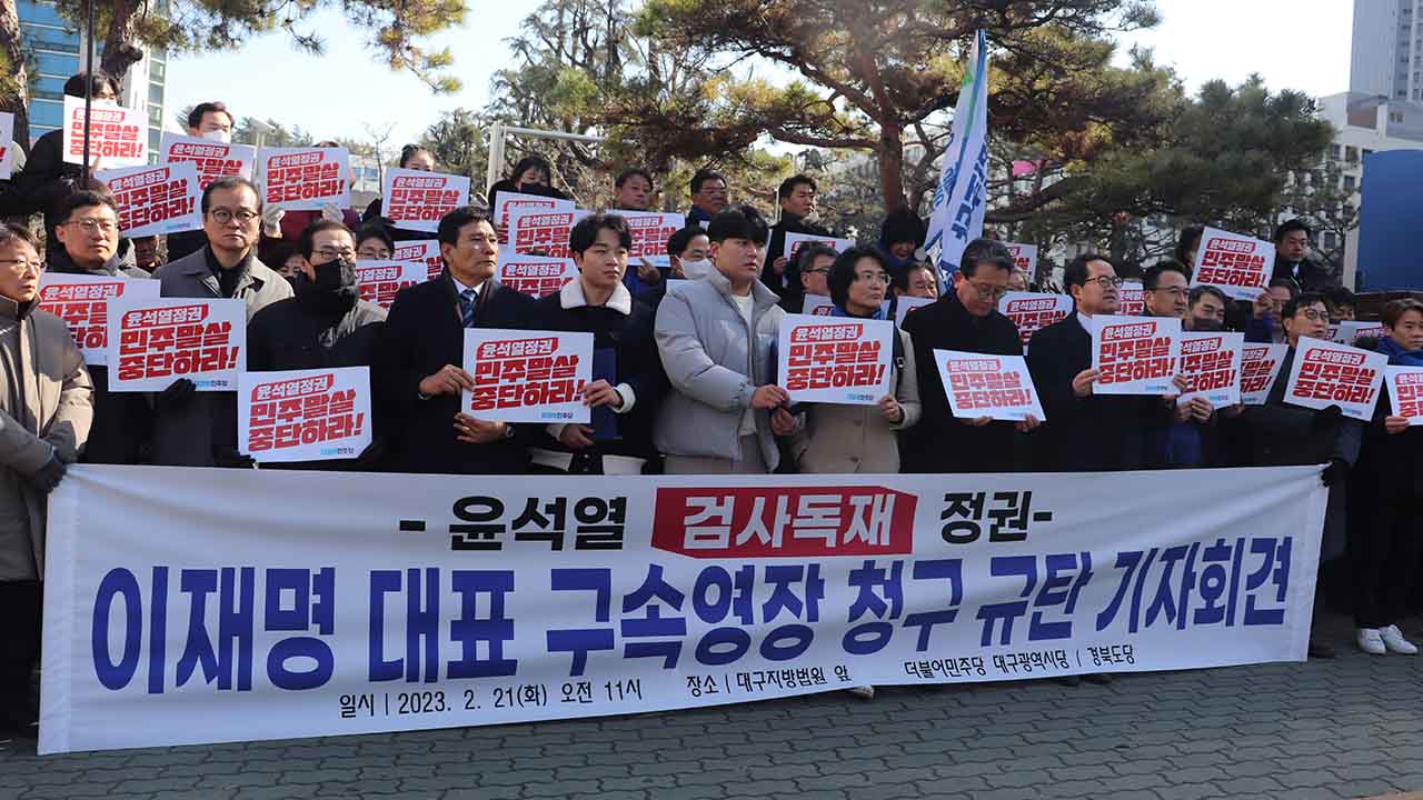 더불어민주당 대구시당과 경북도당 당원 100여 명은 2월 21일 대구지방검찰청 앞에서 '이재명 대표 구속영장 청구 규탄 기자회견'을 열었습니다.강민구 대구시당 위원장은 "진실만을 따라가는 공평한 검사는 어디에 있는가"라며 "5년짜리 무도한 권력의 충견이 되어버린 어둡고 불의한 검사, 수사권 가지고 보복하는 깡패가...