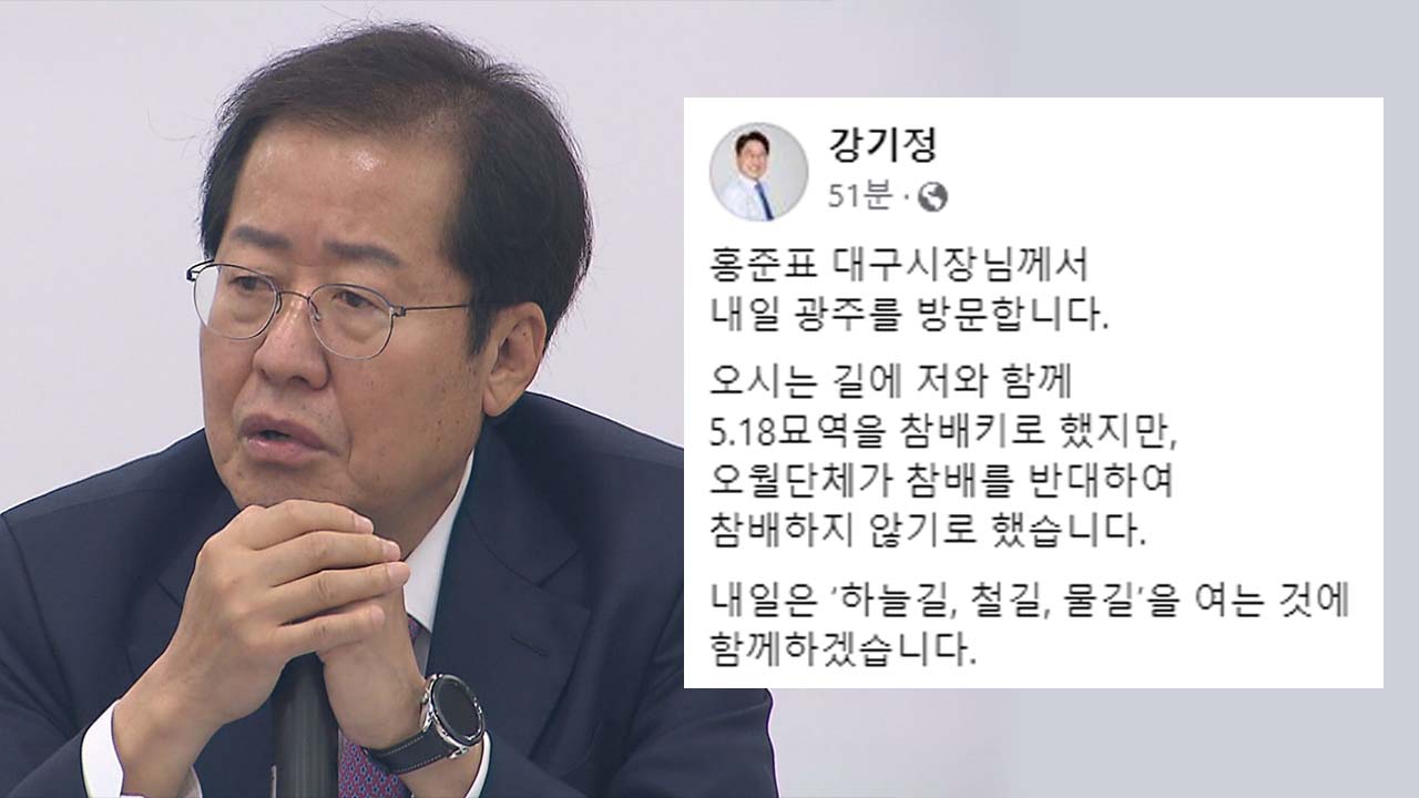 달빛동맹 협약을 위해 25일 광주를 방문하는 홍준표 대구시장이 5·18 묘역을 참배하기로 했다가 관련 단체 반대에 부딪혀 참배하지 않기로 했습니다.강기정 광주시장은 자신의 SNS를 통해 홍준표 시장이 자신과 함께 5·18 묘역을 참배하기로 했지만 "오월 단체가 참배를 반대해 참배하지 않기로 했다"고 밝혔습니다. 대구시...