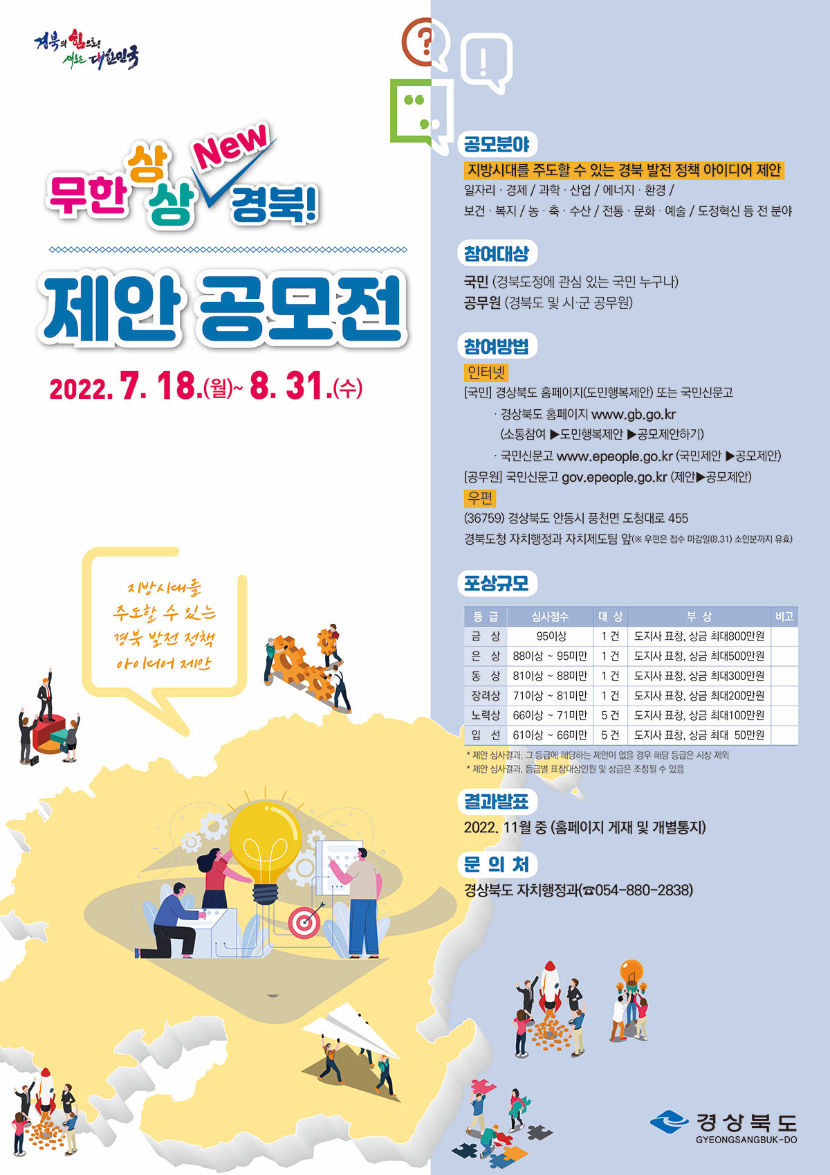경상북도가 민선 8기 정책 제안 공모전을 엽니다. 경상북도는 일자리·경제·과학·산업·보건·복지·문화·예술·도정 혁신 등 지역발전을 위한 다양한 정책 아이디어를 제안할 수 있지만, 이미 시행 중이거나 단순 불만은 제외한다고 밝혔습니다.공모 기간은 8월 말까지로 국민신문고(www.epeople.go.kr) 공모 제안이나 경상북도...