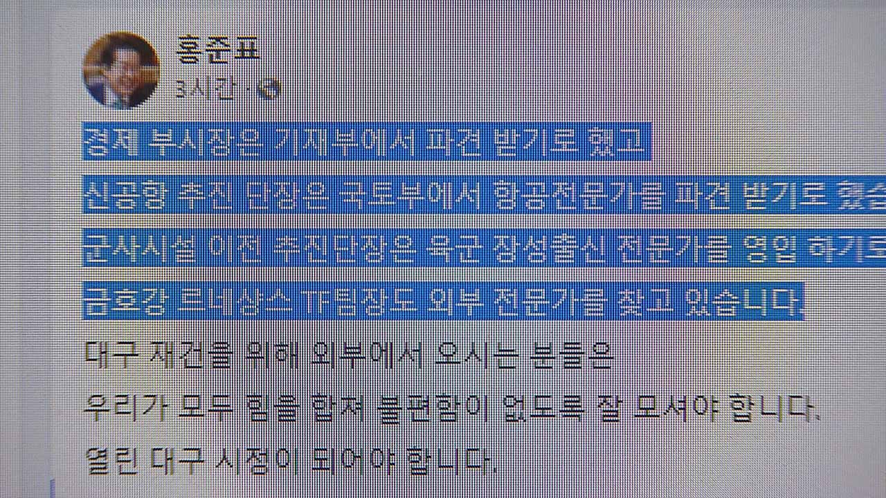 ◀앵커▶홍준표 대구시장 당선인이 자신의 SNS를 통해 파격적인 인사를 예고했습니다. 취임 후 경제부시장을 자신이 임명하지 않고 기획재정부로부터 파견받겠다고 공언한 겁니다.이밖에 다양한 고위직에 외부 전문가를 영입하겠다고 밝혔는데요,대대적인 인사 혁신이 예고되자 대구시청 공무원 조직이 바짝 긴장하고 있습니...