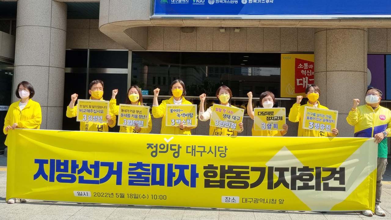 정의당 대구시당은 지방선거 출마자 합동 출정식을 하고 시민들에게 지지를 호소했습니다.정의당은 "대구는 국민의힘 일당 독재로 전국에서 가장 가난한 도시가 됐고, 기득권이 아닌 시민의 편에서 대구를 바꾸겠다"며 선전을 다짐했습니다.이번 지방선거에 대구에서는 대구시장과 대구시의원 비례, 북구와 동구, 수성구 의...