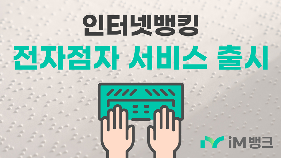 iM뱅크는 시각장애인을 위한 '전자 점자 서비스'를 실시한다고 밝혔습니다. '전자 점자 서비스'는 시각장애인들이 금융거래를 더 정확하고 쉽게 접근할 수 있도록 개인 인터넷뱅킹 내 이체확인증, 통장 사본, 부채 잔액 증명서 등 35개 메뉴에서 '점자 보기' 버튼을 통해 점자 파일을 내려받고, 전자 점자 단말기를 통해 인...