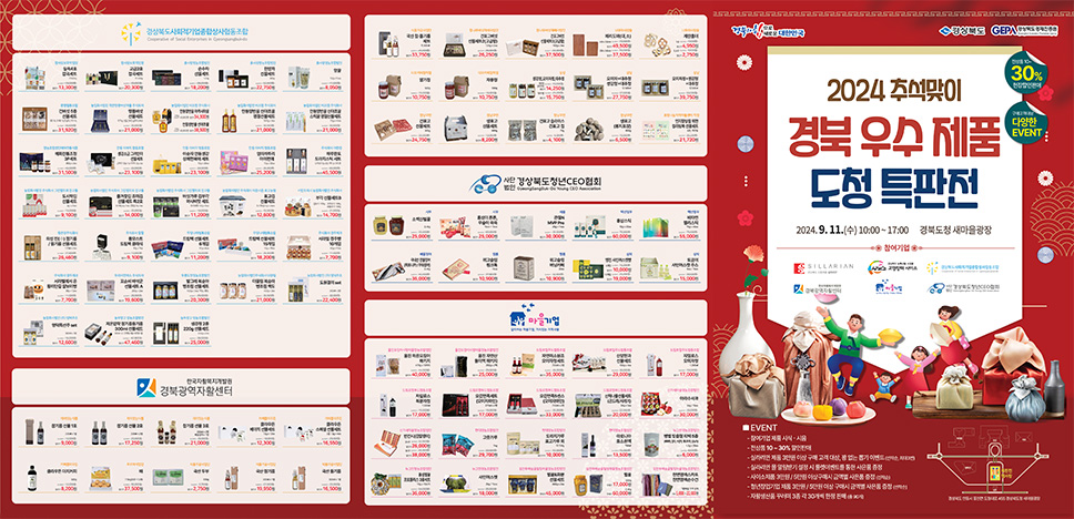 사진 제공 경상북도경상북도는 추석을 맞아 9월 11일 '2024 추석맞이 경북 우수 제품 도청 특판전'을 엽니다. 이번 특판전에는 실라리안 기업들을 비롯해 '사이소', 사회적 기업, 마을기업, 지역자활센터, 청년 기업 등 89개 업체가 참가해 제수용품, 가공식품, 간편식 등 3백여 개 제품을 시중가 대비 30% 싼값에 판매합니...