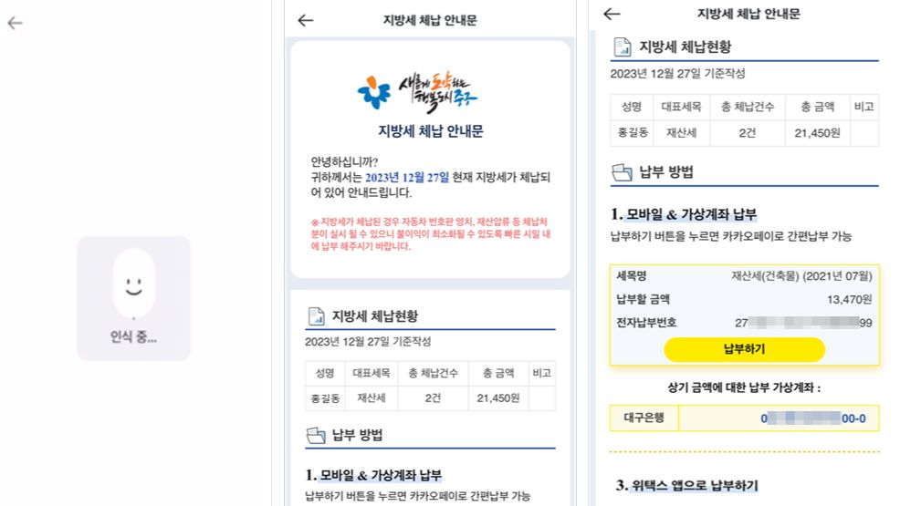 사진 제공 대구 중구대구 중구가 지방세와 세외수입 체납자에게 카카오톡 알림 서비스를 운영합니다.대구 중구는 2023년 12월 카카오톡 알림으로 2,800여 명에게 지방세가 체납됐다고 안내한 결과, 이 가운데 약 24%가 밀린 세금을 냈다고 밝혔습니다.알림을 받으면 본인인증을 한 뒤 위택스로 연계된 상세 내역을 확인하고...