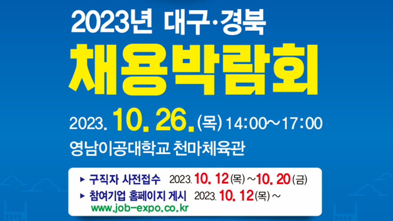 사진 제공 대구지방고용노동청대구지방고용노동청이 10월 26일 영남이공대 천마체육관에서 '2023년 대구·경북 채용박람회'를 엽니다.에스엘, 경창산업, 아진산업, 엘앤에프 등 지역의 35개 우량 기업이 참여해 사무, 영업, 기능기술, 생산직 등 다양한 직종에서 200여 명을 채용하기 위한 현장 면접과 이력서 접수 절차를 ...