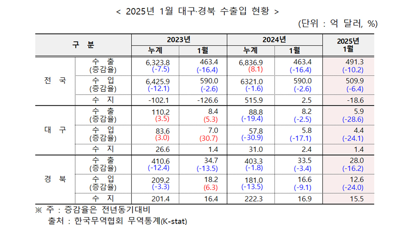 2025년 1월 대구와 경북의 수출이 1년 전보다 큰 폭으로 감소했습니다.한국무역협회 대구경북지역본부가 발표한 '2025년 1월 대구․경북 수출입 동향 보고서'에 따르면, 2025년 1월 대구의 수출은 전년동기 대비 28.6% 감소한 5억 9천만 달러를 기록했습니다. 경북은 16.2% 감소한 28억 달러로 집계됐습니다. 전국 수출이 10...