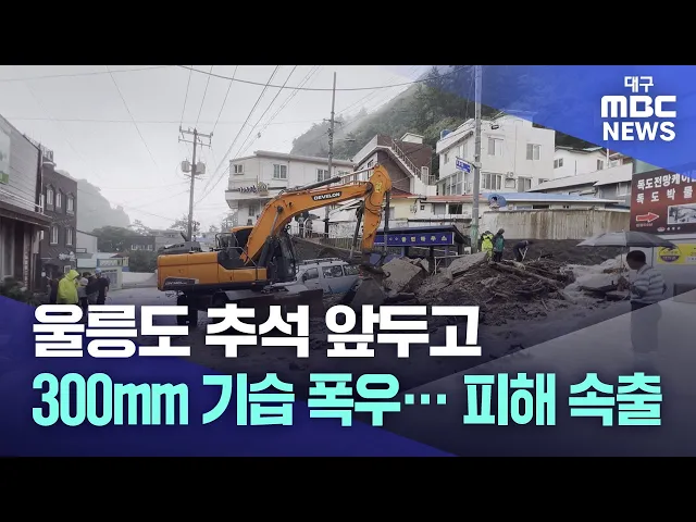 ◀앵커▶울릉도에 갑작스레 3백mm가 넘는 폭우가 쏟아졌습니다.일부 주택가엔 토사가 폭포수처럼 흘러내려갔고 섬 일주도로 곳곳이 무너져내리는 등 피해가 잇따랐습니다.김형일 기자가 보도합니다.◀기자▶거칠게 흐르는 황토빛 흙탕물이 주택가를 가로지릅니다.하얀 차량에 부딪힌 흙탕물은 파도처럼 솟아 오릅니다.산에서 쏟...