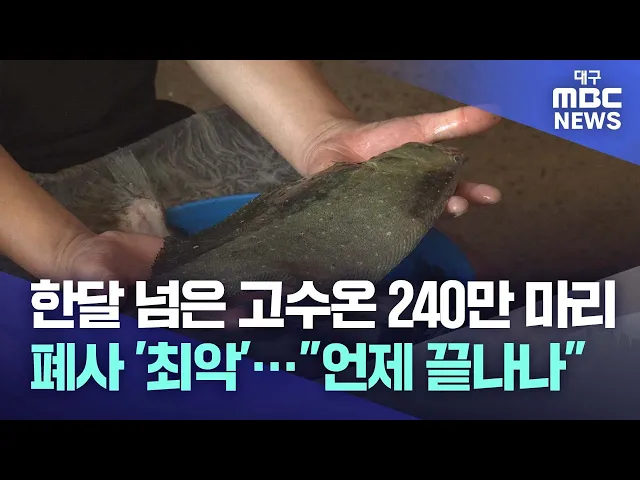 ◀앵커▶9월 중순으로 접어드는데도 폭염이 이어지자 경북 동해안 양식장에선 폐사가 속출하고 있습니다.지금까지 240만 마리가 폐사해 최악의 피해를 기록하고 있는데요.추석을 앞둔 지금까지도 고수온 피해가 이어지면서 양식 어민들은 출하마저 제때 하지 못해 심각한 경영난을 겪고 있습니다.장성훈 기자입니다.◀기자▶경...