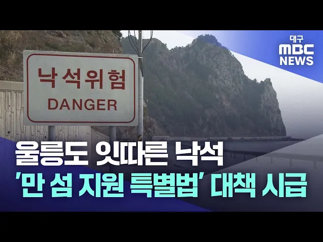 ◀앵커▶울릉도 일주도로에서 위험천만한 낙석 사고가 잇따르고 있습니다.매년 40만 명이 넘는 관광객이 울릉도를 찾는 만큼 낙석으로 인한 인명 피해도 우려되고 있습니다.이 때문에 2023년 연말 국회를 통과한 '국토 외곽 먼 섬 지원 특별법'에 따라 정부 차원의 근본적인 낙석 안전 대책이 수립돼야 한다는 목소리가 높아...
