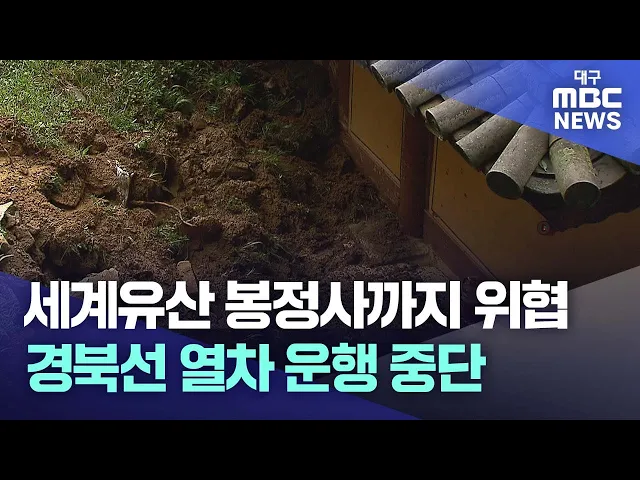 ◀앵커▶사흘째 폭우가 이어진 경북 북부에서는 우리나라에서 가장 오래된 목조건물이죠, 안동의 봉정사 극락전까지 토사에 훼손될 뻔했습니다.경북선은 철로가 유실돼 열차 운행이 전면 중단됐고, 하천 8곳에 홍수특보가 잇따라 발령되는 등 폭우 피해가 이어졌습니다. 이 소식은 이도은 기자가 전해드립니다.◀기자▶안동 봉...