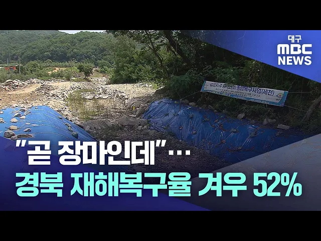 ◀앵커▶제주와 남부지방에 머물던 장마전선이 서서히 북상하면서 경북 북부지역도 이번 주 후반부터 장마에 접어들겠습니다. 이렇게 장마철이 눈앞까지 다가왔지만, 지난해 수해의 흔적이 여전한 경북 지역의 재해복구율은 52%로 크게 더딘 상황입니다.이유가 뭔지, 엄지원 기자가 취재했습니다.◀기자▶2023년 7월 극한 호우...