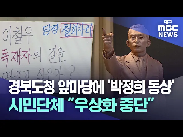 ◀앵커▶2024년 11월이면 경북도청 앞마당인 천년숲에 박정희 전 대통령의 대형 동상이 들어설 것으로 보입니다.민간단체의 갑작스러운 제안을 이철우 지사가 수락하면서 전격 추진되는 모습인데요.최근 도의회에서 신공항 명칭을 '박정희 공항'으로 하자는 주장까지 나왔던 터라, 시민단체들은 "우상화를 중단하라"며 반발하...