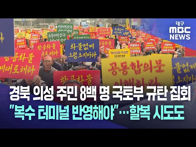 ◀앵커▶최근 대구경북신공항 갈등이 다시 불거질 조짐을 보입니다.쟁점이 된 화물터미널을 의성과 군위, 양 지역에 복수로 두기로 한 대구·경북지역 합의문에 대해, 국토부 책임자가 큰 무게를 두지 않는다는 식으로 말한 게 문제가 된 건데요.4월 2일 경북 의성 주민 8백여 명이 세종시 국토부 앞에서 규탄 집회를 열고, 책...