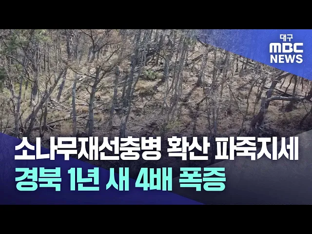 ◀앵커▶소나무의 수관을 막아 말라 죽게 하는 재선충병이 최근 파죽지세로 다시 번지고 있습니다.경북은 피해 면적이 1년 새 4배 이상 늘었는데, 예산 부족으로 감염된 나무를 방치하면서 확산 속도에 기름을 붓고 있습니다.재선충을 옮기는 솔수염하늘소 같은 매개충이 말라죽은 소나무 안에서 월동하는데, 이 곤충이 우화...