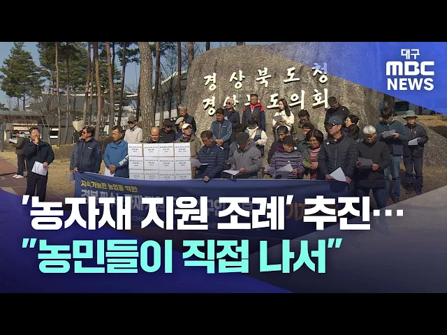 ◀앵커▶기후 위기와 농자재값 폭등으로 농민 소득이 크게 줄다 보니, 농자재비 부담이라도 덜 수 있도록 지원 조례를 요구하는 목소리가 전국적으로 커지고 있습니다.경북지역 농민들도 지난해부터 조례 제정을 촉구해 왔지만, 경상북도와 도의회 모두 이를 외면하면서 결국 농민들이 직접 조례 제정에 나섰습니다.장성훈 기...