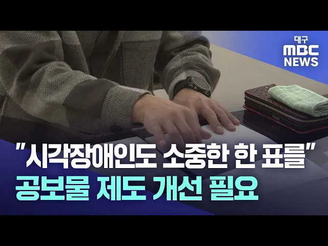 ◀앵커▶제22회 국회의원 선거가 40여 일 앞으로 다가왔습니다.이제 곧 후보들의 공약과 정보가 담긴 공보물을 받아보실 겁니다.그런데 시각장애인들은 공보물을 통해 정보 얻기가 힘들어 투표하는 데 큰 어려움을 겪고 있습니다.장애인 참정권을 실현하기 위해 현행 제도를 보완해야 할 필요가 있습니다.박성아 기자입니다.◀...