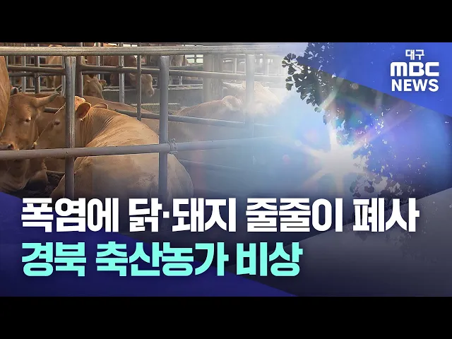 ◀앵커▶일주일째 이어지는 폭염으로 경북에서도 가축 피해가 빠르게 늘고 있습니다.이미 닭과 돼지 16만 마리가 폐사하면서 축산농가에 비상이 걸렸는데요.장마가 일찍 끝난 데다 폭염이 길어질 것으로 보여, 피해는 더 늘어날 것으로 우려됩니다.김경철 기자입니다. ◀기자▶한우 4백여 마리를 사육 중인 경북 안동의 한 축산...