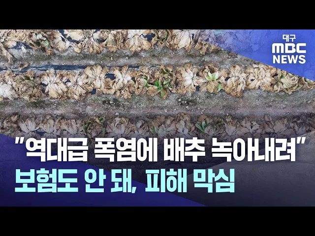 ◀앵커▶경북 청송 지역에서 수확 직전에 있던 배추가 때 이른 역대급 폭염에 녹아내려서 '무름병' 피해 수십 ha가 발생했습니다.청송은 해발이 높아 봄배추 수확을 6월 중순부터 7월 초까지 다른 지역보다 늦게 하는데, 이러다 보니 이 지역에서만 피해가 집중적으로 발생했습니다.배추 재해보험 대상 지역도 아니어서 보상...