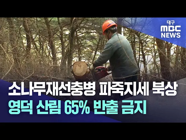 ◀앵커▶소나무재선충병이 경북 동해안을 따라 빠르게 북쪽으로 확산하고 있습니다.경주, 포항에 이어 영덕에서도 지난 2009년 재선충병이 처음 발생했는데, 이제는 영덕군 전 지역으로 번지면서 전체 산림 면적의 65%인 4만 2천 헥타르가 소나무 반출 금지 구역으로 지정됐습니다.김형일 기자가 보도합니다.◀기자▶영덕군 남...