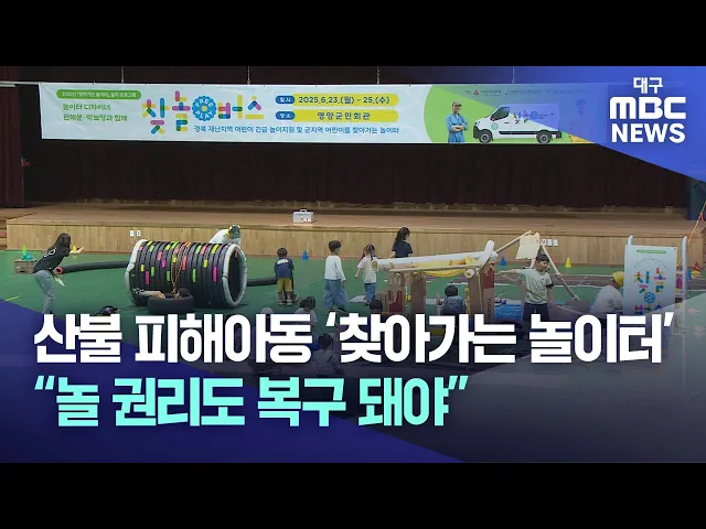 ◀앵커▶석 달 전 산불로 일상이 무너진 건 어른들만의 이야기가 아니었습니다.이웃이 죽고, 집이 불타 대피해야 했던 전쟁 같은 상황에 아이들도 상처가 컸는데요.놀이를 통한 심리 지원이 이뤄지고 있습니다.◀기자▶공사장에나 있을 법한 거대한 원통관.아이들이 다람쥐처럼 기어들어가 놀이를 시작합니다.◀현장음▶"얘들아 ...
