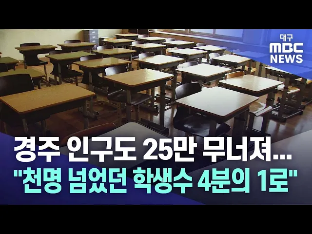 ◀앵커▶2022년 포항시 인구 50만 명이 무너진 데 이어 경주시 인구도 25만 명 아래로 떨어졌습니다.경주의 경우 이미 한 해 출생아 수가 천 명에도 미치지 못해 학교와 보육시설부터 큰 변화를 맞게 될 것으로 예상됩니다.보도에 장미쁨 기자입니다.◀기자▶2023년 개교 100년을 맞은 경주시 안강읍의 한 초등학교.한 교실에 ...