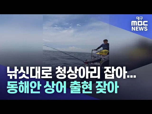 ◀앵커▶경북 포항 앞바다에서 사람을 공격할 수 있는 청상아리가 낚시에 잡히는 특이한 광경이 카메라에 포착됐습니다.동해안에서 2023년 유난히 상어 출현이 잦은데요, 낚싯줄에 걸린 물고기를 상어가 물고가는 일도 자주 목격된다고 합니다. 장성훈 기자가 보도합니다. ◀기자▶포항 호미곶 항 앞바다에서 제철을 맞은 삼치...