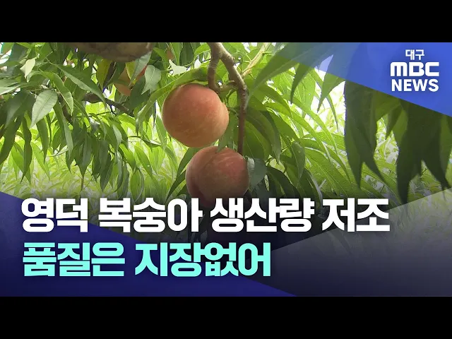 ◀앵커▶여름 피서 시즌에 제철인 영덕 복숭아가 2023년에는 봄 개화기 때 이상 저온과 장마철 탄저병까지 겹쳐 생산량이 크게 감소했습니다.다행히 이번 주 들어 장마가 끝나고 햇살이 내리쬐면서 품질에는 지장이 없다고 합니다.영덕군은 7번 국도변에 복숭아 장터를 설치하고, 온라인 판매를 확대하는 등 농가 지원에 적극...
