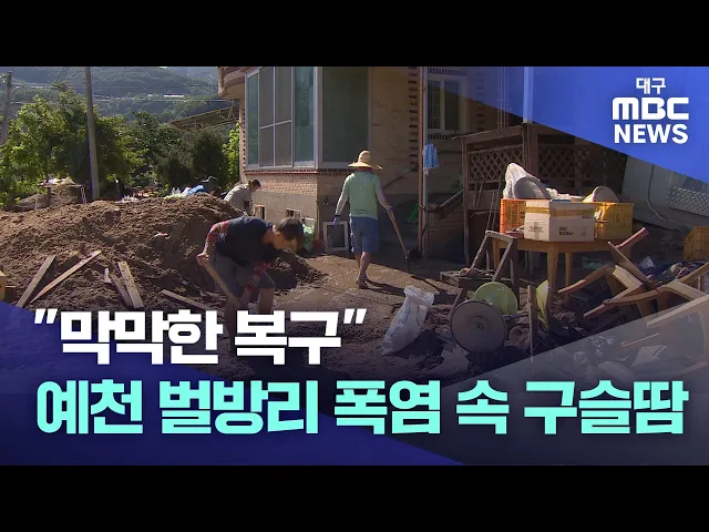 ◀앵커▶비가 잠시 그치면서 경북 예천 산사태 피해지역에서는 복구 작업이 본격적으로 시작됐습니다.하지만 마을 전체가 바위와 진흙으로 뒤덮인 데다, 덥고 습한 날씨까지 더해져 복구는 더디기만 한데요.주민들은 언제쯤 집에 돌아갈 수 있을지 막막하기만 합니다.김경철 기자가 보도합니다.◀기자▶산사태가 마을을 덮친 지...