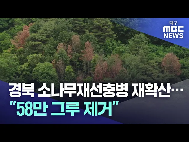 ◀앵커▶소나무재선충병이 경북에서 다시 급속도로 확산하고 있습니다.현재 영양군과 울릉군을 제외한 모든 지역에 재선충병이 발생했는데요.2022년 가을부터 재선충병으로 죽은 소나무가 무려 58만 그루가 넘습니다. 김경철 기자가 보도합니다.◀기자▶안동시 정하동의 한 야산.푸릇한 나무 사이에서 소나무 몇 그루만 갈색빛...