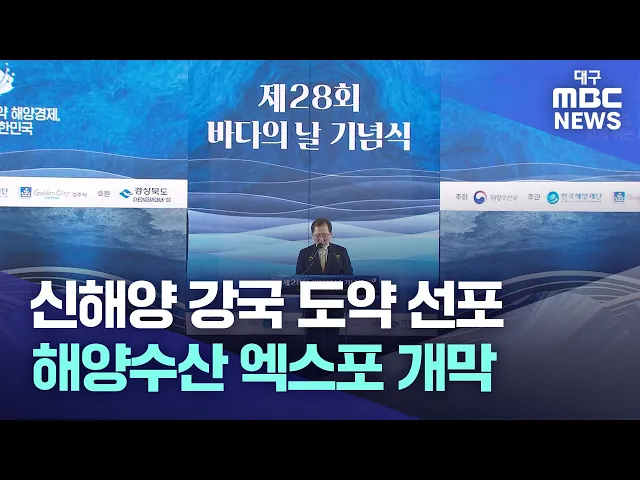 ◀앵커▶5월 31일은 국제연합의 해양법협약 발효를 계기로 1996년 국가가 지정한 바다의 날입니다.정부는 경주에서 기념식을 열고 신해양 강국 도약을 선포했습니다.바다 주간을 맞아 경주에선 6월 2일까지 해양 수산 엑스포가 이어집니다.임재국 기자가 보도합니다.◀기자▶2023년으로 28번째를 맞는 바다의 날. 1996년 지정된...