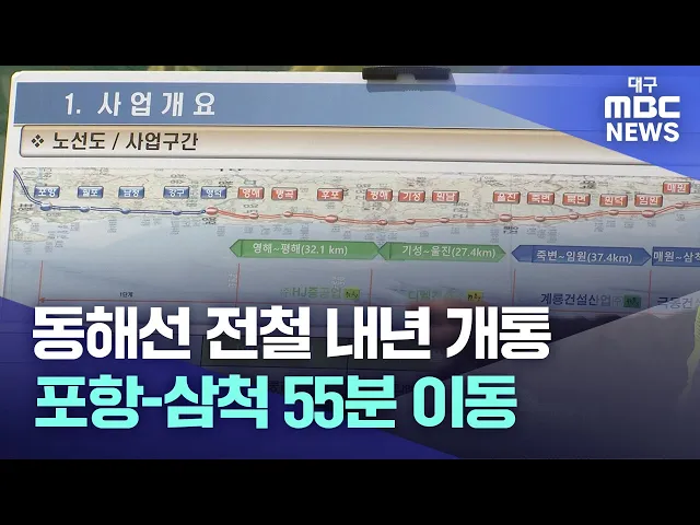 ◀앵커▶포항-영덕 간 동해선 철도 1구간이 지난 2018년 개통한 데 이어, 2024년에는 영덕에서 삼척까지 전 구간 완전 개통을 앞두고 막바지 공사가 한창입니다.전철화도 함께 이뤄지는데요.2024년이면 포항에서 삼척까지 1시간 안에 이동할 수 있어 동해안 관광 활성화에도 변화가 기대됩니다.보도에 김형일 기자입니다.◀기...