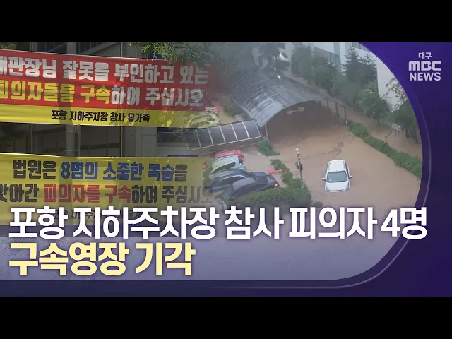 ◀앵커▶2022년 태풍 힌남노로 발생한 포항 아파트 지하주차장 참사와 관련해 한국농어촌공사와 아파트 관리사무소 관계자 등 4명에 대한 구속영장이 기각됐습니다.검찰은 이들이 업무에 주의를 다하지 않아 주민들을 사망에 이르게 했다고 봤는데요, 법원은 증거를 인멸하거나 도주할 우려가 없다고 판단했습니다.박성아 기...