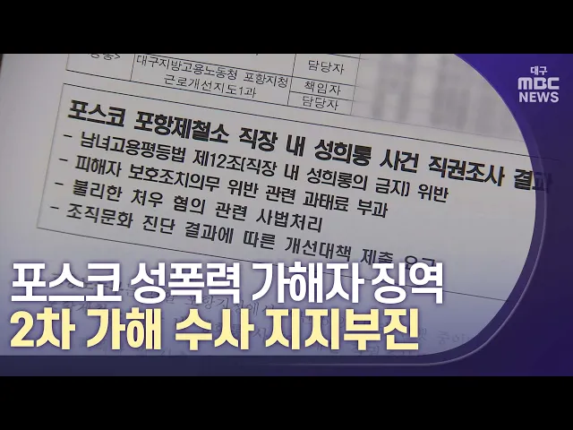 ◀앵커▶2022년 포스코 포항제철소에서 여성 직원이 같은 부서 남성 직원들을 성폭력으로 고소한 사건과 관련해, 가해 남성이 1심에서 징역형을 선고받았습니다.그런데 당시 2차 가해 혐의로 논란이 된 임직원들은 사건 발생 1년이 되도록 입건조차 안 된 것으로 확인됐습니다.박성아 기자가 보도합니다.◀기자▶2022년 5월, 포...