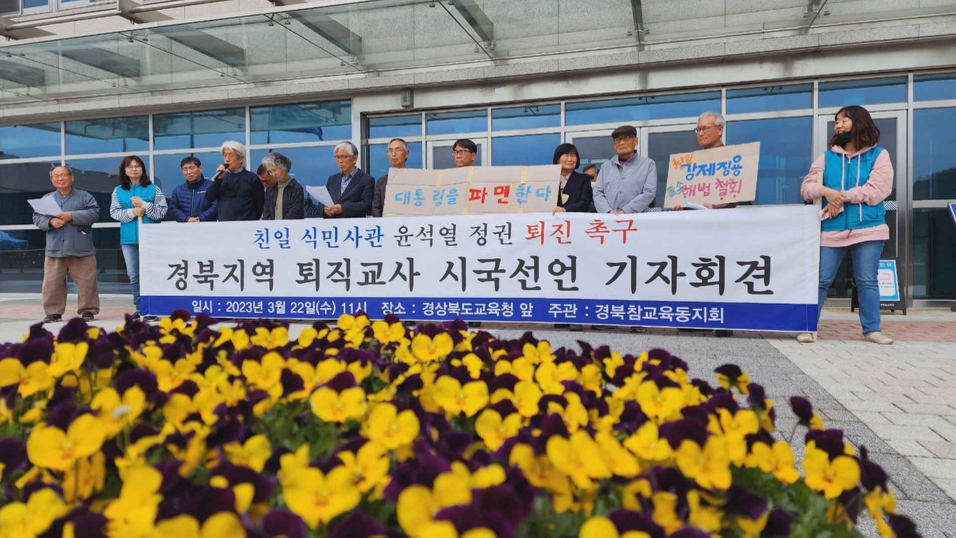 윤석열 정부가 일제 강제 동원 피해자 배상 해법으로 제삼자 변제안을 발표한 것과 관련해, 경북지역 퇴직 교사 260여 명으로 구성된 경북 참교육동지회는 시국선언을 발표했습니다.경북교육청 앞에서 열린 시국선언에서 교사들은 "강제노역 피해자들의 배상 권리를 부정하는 것은 일제 강점을 합법화하고 헌법이 선언한 대...